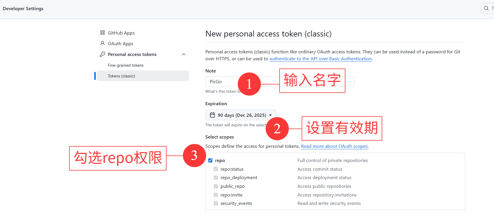 • 选择令牌的 “Scopes” 或权限。根据你利用令牌的目的,选择合适的权限。例如,如果你只需要访问仓库内容,可以选择 “repo” 权限。