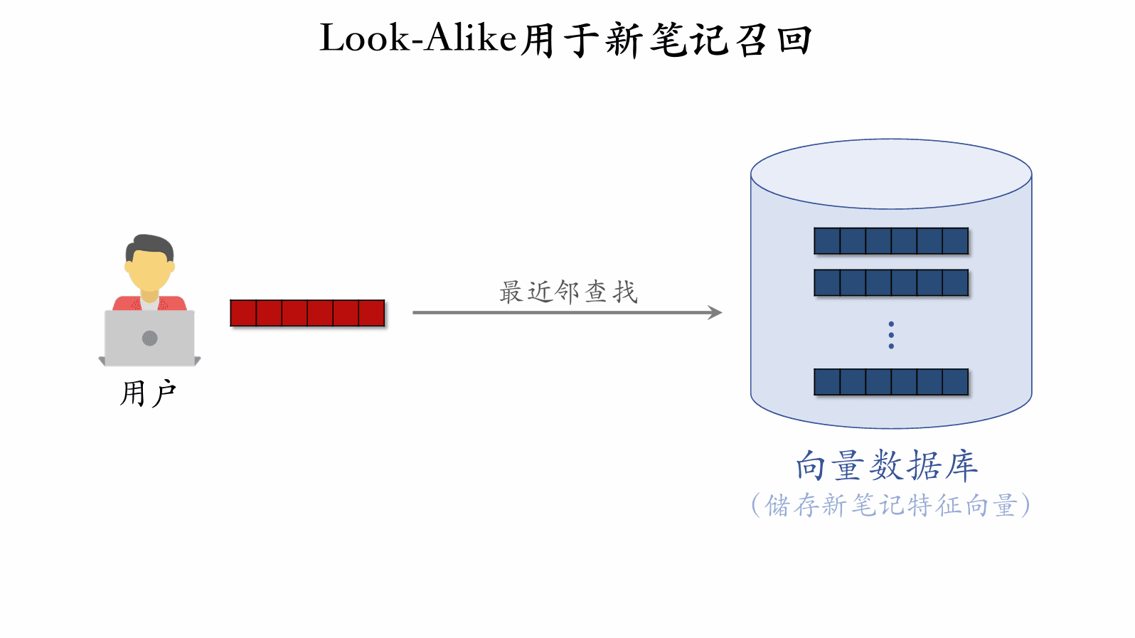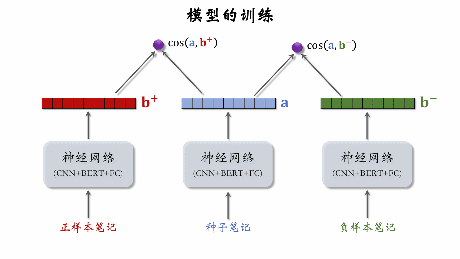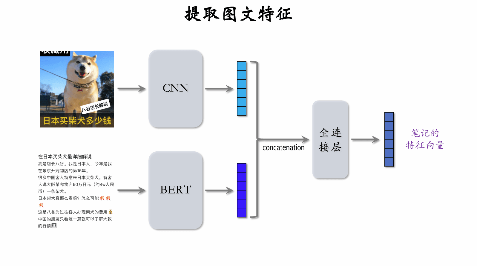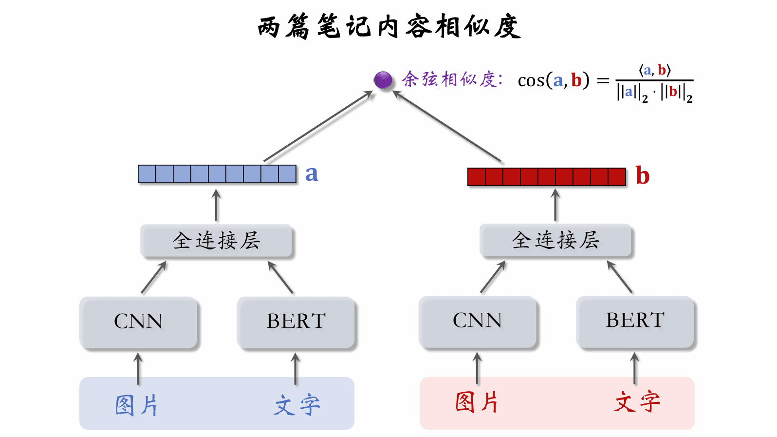 • 事先训练一个神经网络,基于笔记的类别和图文内容,把笔记映射到向量。