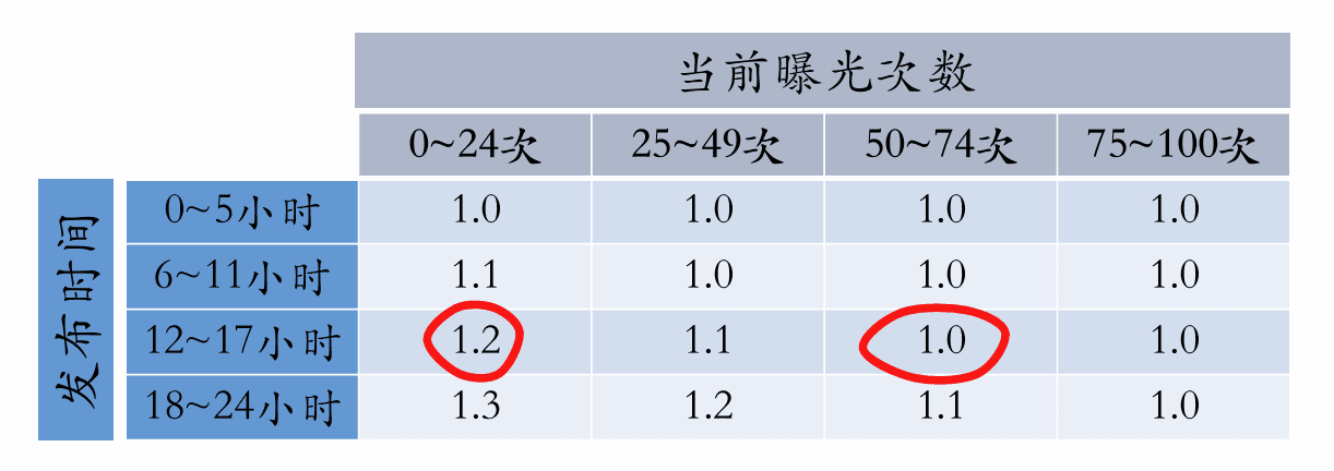 提权系数=f(发布时间目标时间,已有曝光目标曝光)=f(0.5,0.2)\text{提权系数} = f\left( \frac{\text{发布时间}}{\text{目标时间}}, \frac{\text{已有曝光}}{\text{目标曝光}} \right) = f(0.5, 0.2)